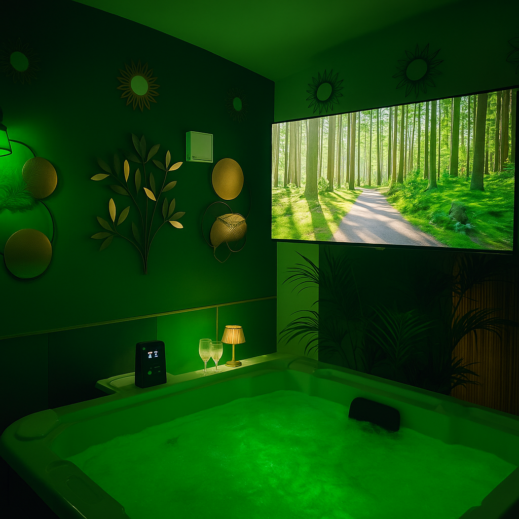 Suite wellness di Lusso con spa privata ad uso esclusivo, cinema privato 4K con proiettore in camera da letto, mini-piscina idromassaggio con cromoterapia, poltrona massaggiante e doccia emozionale.
